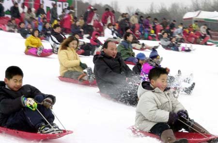 휴일을 맞아 서울의 한 놀이공원을 찾은 가족들이 눈썰매를 즐기고 있다.<변영욱기자>