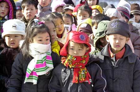 관악구 신림동 도림천에 설치한 관악 얼음썰매장에 두툼한 방한복과 마스크를 착용한 어린이들이 얼름썰매타기 대회참석 차례를 기다리고있다<권주훈기자>