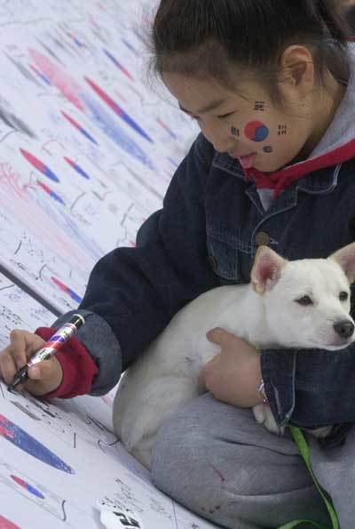 1일 서울 중구 남산골 한옥마을에서 3.1절을 맞아 열린 '독립의 함성,태극의 물결'행사에서 참가한 한 어린이가 애견을 안고 대형 통천에 정성스레 태극기를 그리고 있다.<이종승기자>