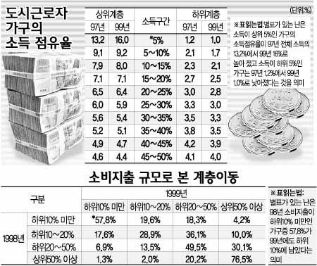 가족이 전부 일을 하지 않아도 중류층 이상(상위 50% 이상)에 속한 가구는 96년 이후 계속 늘어나 99년의 경우 9%에 달했다. 부동산이나 금융자산 등 비근로 소득에서도 빈부격차가 심화된다는 뜻이다.
