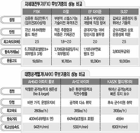 ▽기종결정 이미 끝?〓미 정부나 군부 인사들은 기회 있을 때마다 “한미 연합작전과 상호운용성 차원에서 미제를 구입해야 한다”고 노골적으로 강조해 왔다. 항간에는 공군의 FX와 육군의 대형공격헬기(AHX)사업이 모두 미 보잉사의 F15K와 AH64D로 이미 결정됐고 나머지는 들러리에 불과하다는 얘기마저 흘러나온다.