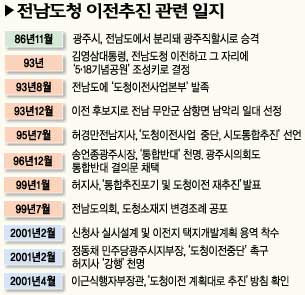 ▽도청 이전 청사진〓정부 방침대로 이전 사업이 추진된다면 신청사 건립은 2004년말 마무리된다. 신청사 편입 토지에 대한 보상 절차가 98%선에 이르러 10월부터는 본격적인 공사에 들어갈 예정. 2조5000억여원의 사업비가 투입되는 남악신도시 건설도 2019년까지 연차적으로 진행된다.