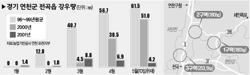 한편 기상청은 “비가 많이 왔던 97, 98년의 경우 3∼5월 중순 강수량은 서울 수원 철원 등이 250∼290㎜였고 평년값도 200㎜내외였다”면서 “올해는 서울이 38.2㎜, 동두천은 27.5㎜로 예년의 15%수준”이라고 밝혔다.