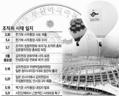 조직위가 발족된 95년 이후 사무총장이 4번이나 바뀐 데다 정치권의 끊임없는 간섭 및 조직위와 부산시의 기(氣)싸움 등으로 한시도 잡음이 수그러들고 있지 않기 때문. 여기에 여야가 역전된 듯한 부산지역의 정치풍향도 역시 사태를 꼬이게 하는 요인이다.