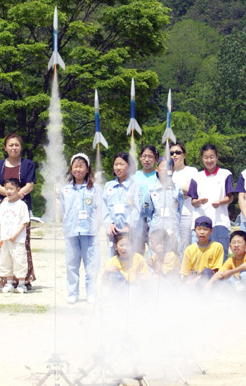 27일 한국우주정보소년단 주최로 서울대 운동장에서 열린 ‘모형 로켓대회’에서 이 소년단 소속 초등학생 등이 화약을 이용해 공중으로 발사되고 있는 모형 로켓들을 바라보고 있다.