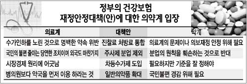의료계는 또 현행 40% 수준인 일반 의약품의 비율을 늘리는 문제와 관련해 “환자가 아프면 약국으로 먼저 가라고 유도하는 것과 다를 게 없다”면서 정부의 대책이 엉뚱한 방향으로 가고 있다고 비판했다. 행위별 수가제가 아닌 질병별 포괄수가제 도입도 의료의 질을 떨어뜨린다는 주장이다.