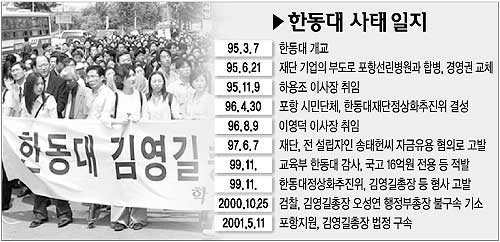▽사태의 발단〓한동대는 포항지역에서 쓰레기매립업으로 돈을 번 송태헌씨가 320억원을 투자해 95년 설립한 대학. 그러나 쓰레기매립장 붕괴사고로 송 이사장이 운영하던 기업이 부도가 나면서 재원 조달이 어렵게 되자 포항선린병원과 합병했고 학교 경영권도 교체됐다.