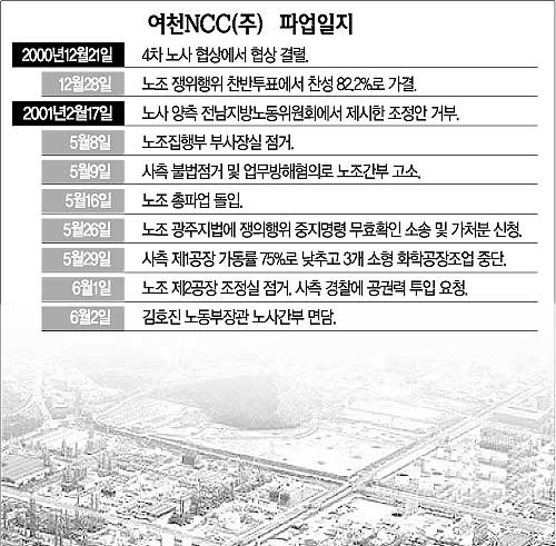▽파업=여천NCC는 대림산업㈜나프타분해공장과 한화석유화학㈜ 여천공장이 99년 석유화학공장 자율구조조정에 따라 합병된 회사로 조합원 720명을 포함 전체 직원이 1000여명에 이르고 있다.