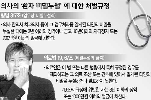 ▽관련 법규정〓의사의 환자 비밀 누설을 처벌하는 법 조항은 형법 317조의 ‘업무상 비밀누설’과 의료법 19조와 67조의 ‘비밀누설의 금지’ 조항. 또 의료법 52조는 비밀누설로 처벌받은 의사는 의사 자격을 박탈하도록 규정하고 있다.