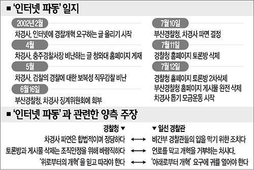 ‘인터넷 항명’을 이유로 파면된 부산 금정경찰서 차재복(車載馥·37) 경사 사건을 계기로 경찰 수뇌부에 대한 조직 내 불신이 고조되고 있다.