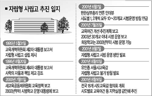 ▽도입계획 혼선〓한완상(韓完相) 부총리 겸 교육인적자원부장관은 6월 7일 한 일간지와의 인터뷰에서 “자립형 사립고는 시도별로 1, 2개씩, 모두 10∼20개교를 선정해 2003년부터 시범 운영하겠다”고 말했다.