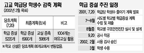 교육부가 7월 20일 대통령의 공약사항이라며 당초 계획보다 2년 앞당긴 내년 2월까지 고교 학급당 학생수를 42.7명에서 35명으로 줄이겠다고 발표한 이후 일선 고교는 “무리한 증축 계획으로 날림 공사에 애써 확보한 예산만 날릴 판”이라고 반발하고 있다.