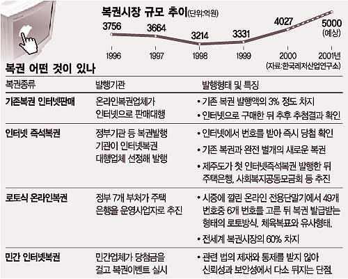 인터넷 즉석복권이란 인터넷을 통해 복권을 사서 즉석에서 당첨 여부를 확인할 수 있도록 한 것. 한번 빠진 사람은 매일 찾게 된다. 5월 서비스를 시작한 한 민간복권업체의 회원은 4개월 새 6만명으로 급증했다. 이 방식의 복권은 제주도가 올해 초 처음 발행했다.
