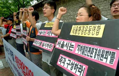 지하철공사 노조와 환경단체 회원 20여명이 6일 서소문동 시청 별관 앞에서 석면 피해 진상 규명과 대책 마련을 촉구하는 집회를 열었다.<원대연기자>