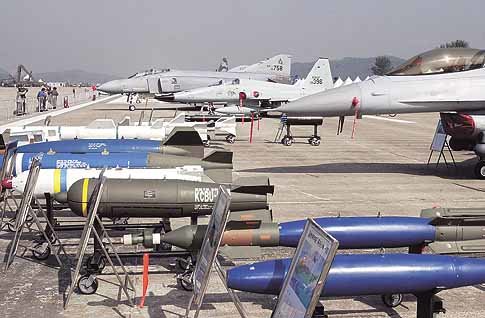 16개국 175개 업체가 참가한 동북아 지역 최대 에어쇼인 ‘서울 에어쇼 2001’이 경기 성남시 성남비행장에서 15일 개막됐다. 각종 최신예 전투기와 미사일 등 전투기에 장착하는 무기들이 전시돼있다. 다양한 곡예 비행도 펼쳐진다. 18일까지는 전문 관람객만 입장이 가능하며 19∼21일에는 일반인도 관람할 수 있다. <변영욱기자>