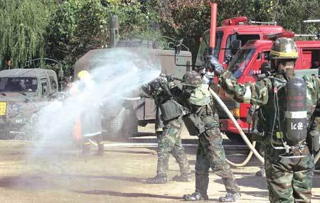 탄저균 테러 공포가 전 세계로 확산되고 있는 가운데 17일 서울 서초구의 화생방 방호사령부 연병장에서 군인들이 ‘화생방 테러 대비훈련’을 하고 있다. 군인들이 독가스가 살포된 상황을 가정해 오염된 곳을 물로 씻어내고 있다. <신원건기자>