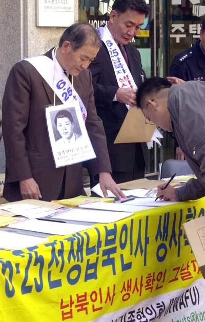 6.25전쟁 납북인사 가족협의회는 20일까지 서울 명동 주택은행 앞 등 수도권 10여곳에서 납북인사의 생사확인을 촉구하는 대국민 서명운동을 실시하고 있다. 18일 오전 명동에서 ‘국경의 밤’을 지은 시인 김동환씨의 아들 영식씨(왼쪽) 등이 서명을 받고 있다. <변영욱기자>