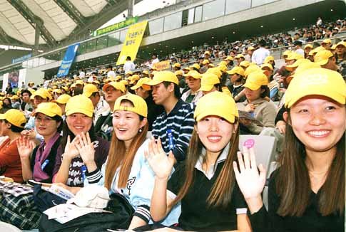 ‘월드컵 성공은 자원봉사자들이 이끌어요.’ 착공 3년 만인 27일 오후 서울 마포구 상암동 월드컵 주경기장에서 열린 ‘2002 월드컵 자원봉사자 발대식’에 참석한 시민들이 선서를 하고 있다. <원대연기자>