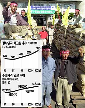농민들은 정부의 쌀 수매분 575만석 외에 농협과 민간의 미곡종합처리장(RPC)이 매입하는 950만석은 40㎏짜리 한가마당 5만원선으로 최저 생산비에도 못미친다고 반발하고 있다.