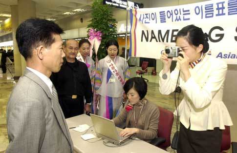 1일 김포공항 국내선 새 청사 3층에서 아시아나항공 여직원이 여행가방에 부착하는 이름표에 넣을 승객의 인물 사진을 찍어주고 있다. 아시아나항공측은 이날 옛 국제선 1청사가 국내선 청사로 단장돼 문을 연 기념으로 이 같은 서비스를 실시했다. <이훈구기자>