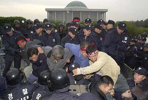 전국농민회총연맹 소속 농민 50여명이 5일 오전 서울 영등포구 여의도 국회의사당 앞에서 정부의 쌀수매 정책에 항의해 기습 시위를 벌이자 경찰이 긴급 출동해 이들을 연행하고 있다.「석동률기자」
