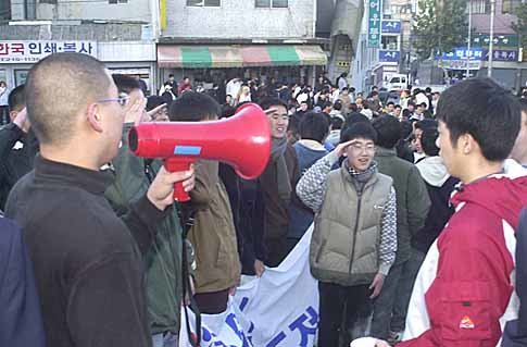 7일 제47지구 14시험장인 청주시 상당구 내덕동 청주상고 정문 앞에서 모 고교재학생들이 시험장에 들어서는 선배에게 거수경례를 하고 있다.「연합뉴스」