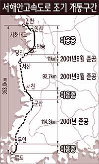 서해안은 중국과 무역의 전진기지로 떠오르는 곳. 정부는 평택항 건설과 군산 목포항 개발을 서두르고 있다. 항구가 제 구실을 하려면 바닷길 뿐 아니라 육상 교통이 원활해야 한다. 그 역할을 서해안고속도로가 맡았다.