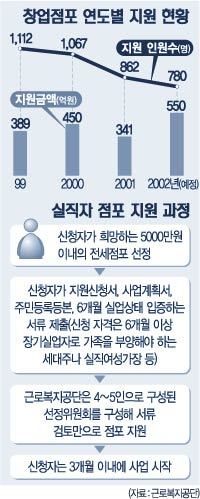 이 사업은 외환위기로 실업자가 급증하자 근로복지공단이 1999년 ‘장기 실업자 자영업 창업지원 사업’ 중 하나로 마련한 것으로 5000만원 이내의 점포를 임대해 장기 실업자에게 연리 7.5%의 이자만 받고 빌려주는 제도다.