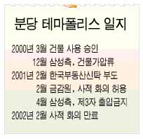▽테마폴리스 사태〓테마폴리스는 2000년 3월 분당구 야탑동 8300평 부지에 지하 4층 지상7층 연건평 6만2400평 규모의 초대형 버스터미널 겸용 복합상가로 신축됐다. 그러나 까르푸, 복합영화관인 CGV 등 10여개 업체만 입점한 채 한부신이 부도처리되면서 문제가 불거지기 시작했다.
