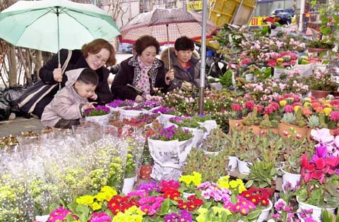 봄을 재촉하는 봄비가 내린 5일 서울 종로5가 인도변 꽃시장.