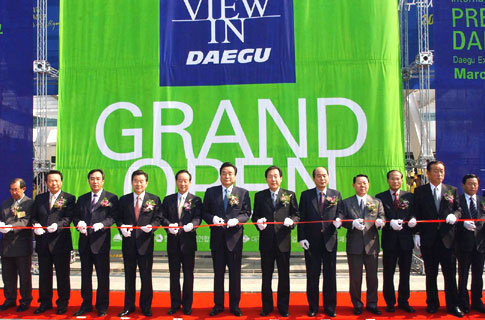 13일 대구 컨벤션센터에서 열린 대구 국제섬유박람회 개막식에 이한동총리를 비롯한 관계자들이 테이프커팅을 하고 있다.