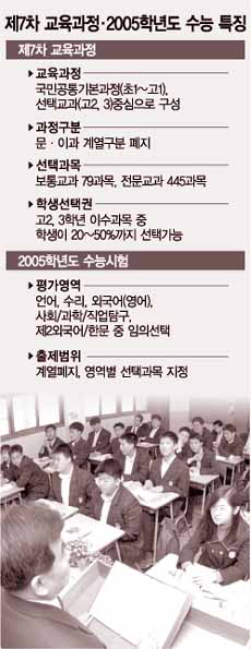 제7차 교육과정은 초등 1년∼고 1년 10년간 국민공통기본교육과정을 배운 뒤 고 2, 3학년 때 일반선택과 심화선택 등 79개 과목 중 학생들이 선택할 수 있게 한 것으로 올해 고 1학년부터 연차적으로 적용된다.