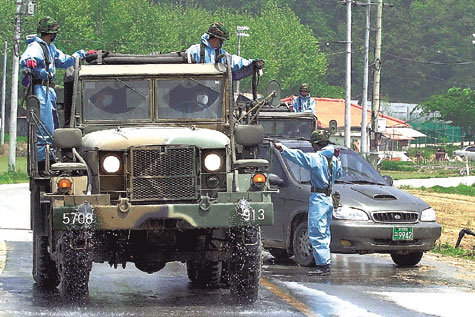 구제역이 추가 발생한 경기 용인시 백암면에서 12일 군부대 장병들이 출입 차량을 대상으로 방역작업을 실시하고 있다.