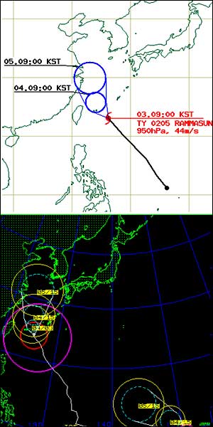 일본 교통성은 5일 오전 9시에는 제주도를 비롯해 서해남부지방이 태풍의 직접적인 영향권에 들것으로 예상하고 있다. 또 5일 오후 3시에는 서해안 일대 모두가 태풍의 영향권에 포함된다고 예측했다.