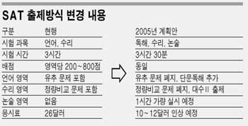 ▽어떻게 달라지나〓6월27일 미국 전국대학위원회(College Board)는 2005년 3월부터 실시되는 SAT에서 독해력, 수리능력의 비중을 늘리고 논술 시험을 추가한다고 발표했다.
