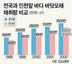 업계는 지난해 수도권 건설시장에 공급된 인천 앞바다 바닷모래는 수도권 전체 모래 사용량의 80%를 웃도는 1800만㎥으로 추산했다.