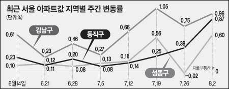 부동산 정보 제공업체인 ‘부동산114’ 조사에서도 8월 첫주 동작구와 성동구 아파트값은 전주 대비 0.87%와 0.60% 올라 6월 이후 가장 높은 상승률을 보였다.