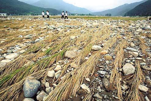 태풍 루사로 강원 정선군 북평면 남평리에 있는 골지천 둑이 붕괴되면서 물이 인근 수만평의 논을 덮쳐 벼들이 모두 쓰러지고 논은 자갈밭으로 변하다시피 황폐화됐다.