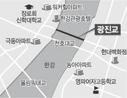 1936년 왕복 2차로로 건설된 뒤 1950년 6월 28일 미군의 한강 교량 폭격으로 두 동강이 났던 광진교는 97년 3월 확장 공사가 시작돼 현재 78%의 공정률을 보이고 있으며 내년 말 완공될 예정이다.