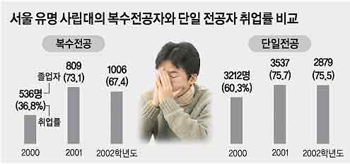 내년 2월 서울 유명 사립대를 졸업예정인 두모씨(27)는 “취업에 도움이 될 것 같아 경영학을 복수전공으로 택했지만 복수전공을 한 동료 가운데 취업에 성공한 경우가 거의 없을 정도”라고 말했다.