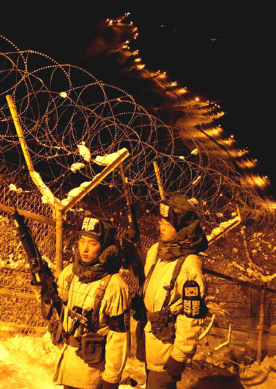 영하 20도 가까이 기온이 떨어진 강원 철원군 비무장지대의 눈덮인 청성 OP 철책에서 27일 청성부대 장병들이 강추위에도 아랑곳하지 않고 야간경계근무를 서고 있다.