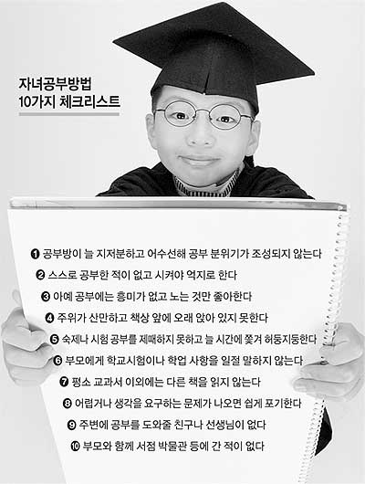 삼성생명 공익재단인 사회정신건강연구소가 마련한 ‘자녀 공부 방법 10가지 체크리스트’를 통해 아이가 어떤 문제를 가지고 있는지 알아보자. ‘아니오’는 1점, ‘예’는 0점을 준다.