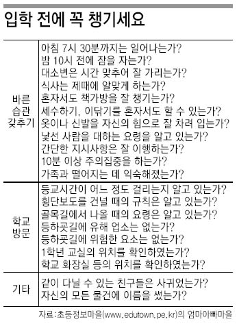 토요일이나 일요일에 식구들이 함께 학교를 한 바퀴 돌아본다. 어디에 무엇이 있나 대강 살펴봐 두면 입학해서도 덜 낯설 것이다. 1학년 교실은 어디에 있는지, 화장실은 어떻게 가는지, 교무실이나 강당이 있는 자리도 알아놓는다. 또 걸어서 학교까지 가는 시간은 얼마나 걸리나, 조심해야 할 곳은 없나, 건널목을 건너야 한다면 길 건너는 것까지 다시 한번 주의를 주면서. 15∼16일이나 22∼23일을 활용해도 된다.
