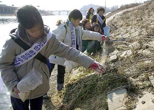 5일 서울 성동구의 초중학생들이 중랑천에서 환경단체 회원들과 함께 ‘새 모이 주기 행사’를 벌이고 있다.