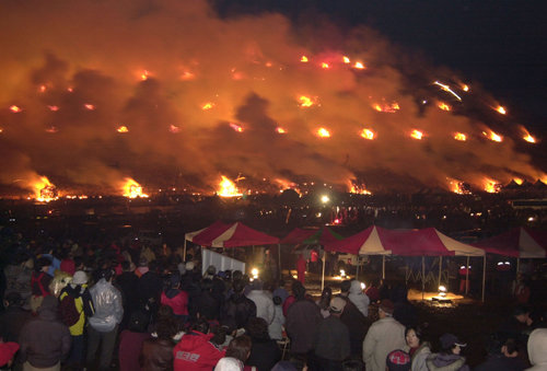 15일 제주도 북제주군 애월읍 새별오름에서 열린 제7회 정월대보름 들불축제 참가자들이 장관을 이룬 들불을 감상하며 새해 소망을 기원하고 있다.「연합」