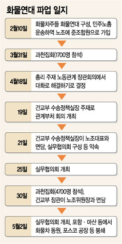 ▽일부 해제=화물연대 포항지부는 7일 오후 포스코, INI스틸 등 포항지역 철강업체에 대한 봉쇄를 풀고, 대한통운 등 5개 운송업체의 운행을 허용했다. 화물연대는 이날 오전 포항지역 5개 운송업체와 협상을 벌여 다단계 알선 근절 노력, 노조탄압 중단, 운송료 인상 등 주요 요구사항에 긍정적 합의가 이뤄지자 봉쇄를 풀었다. 이에 따라 포스코는 오후 4시10분경부터 출하를 시작했다.