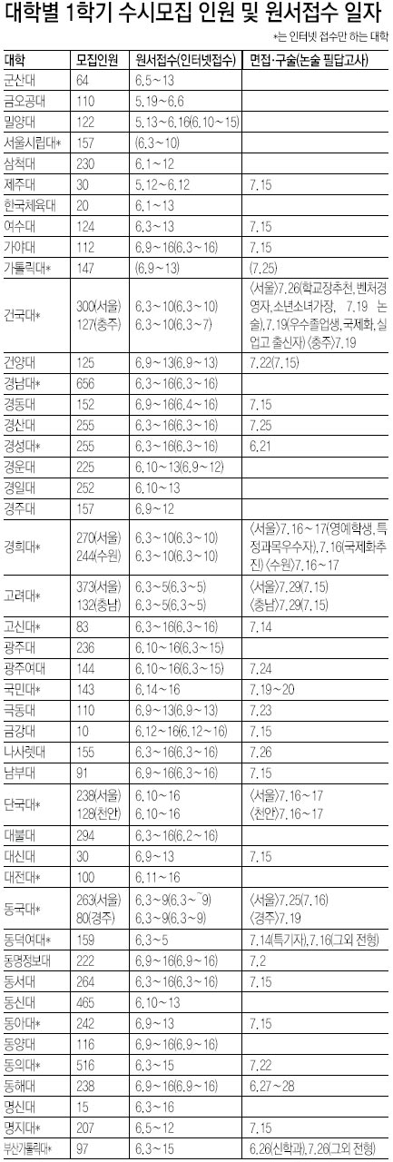 ▽재수생 전형을 노려라=재수생들은 수시보다는 정시모집을 선호하는 경향이 있다. 그러나 올해 수시모집에서는 재수생이 지원할 수 있는 기회가 넓어졌다. 또 1학기 수시모집에서 서울시립대는 전년도 수능성적 우수자를 153명, 가톨릭대는 62명 모집하는 등 재수생 이상만 지원이 가능한 전형도 있으므로 재수생과 재학생의 지원 가능 여부를 잘 파악해 지원해야 한다.