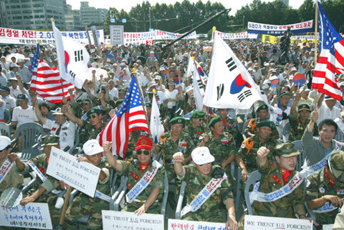 자유시민연대 재향군인회 한국기독교총연맹 등 보수단체 소속 회원 5000여명이 15일 오후 서울시청 앞에서 열린 ‘건국 55주년 반핵·반김 8.15국민대회’에 참석해 구호를 외치고 있다.