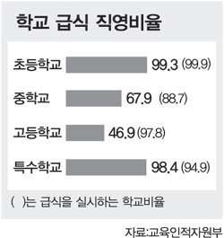 전국의 학교 급식은 초등학교의 경우 학교 직영이 99.3%나 되지만 중고교는 각각 67.9%, 46.9%에 불과하다. 특히 서울에서는 중학교의 100%, 고교는 96.6%가 위탁급식을 받고 있다.