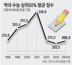 | 원점수 기준, 2003년은 실제 수능 성적, 2004년은 표본채점 성적. -자료:한국교육과정평가원 | ||||||||